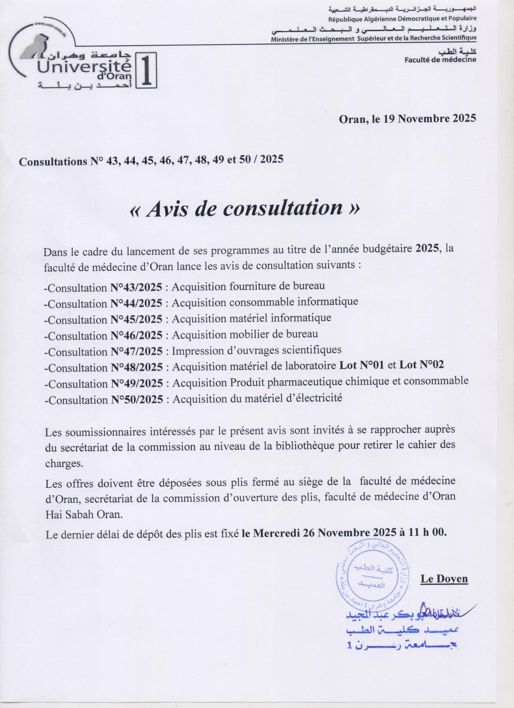 Avis de Consultation N° 43,44,45,46,47,48,49 et 50/ 2025